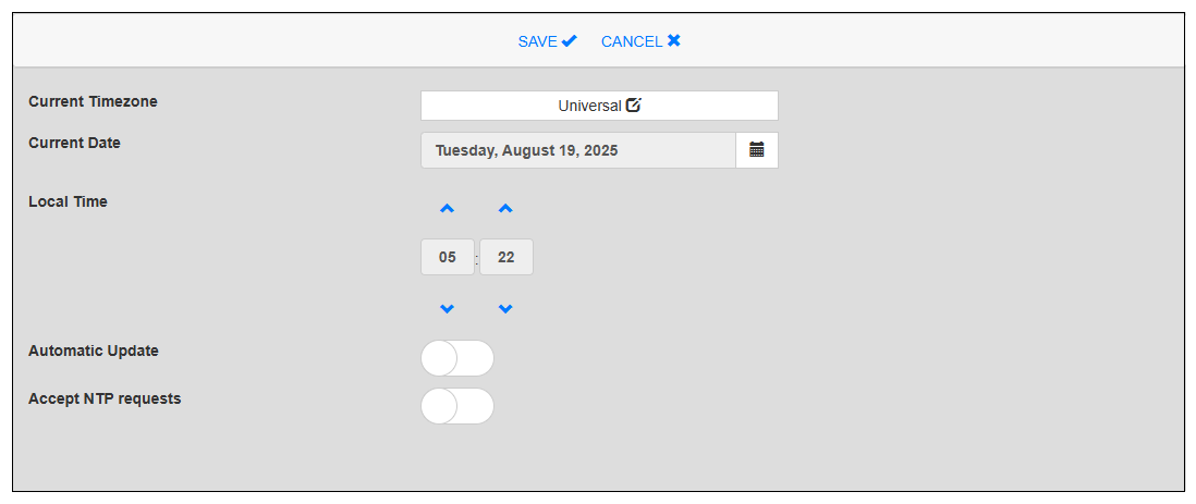 Actualiza automáticamente la hora del producto sincronizándola con el servidor NTP. Conf. por defecto: Apagado |