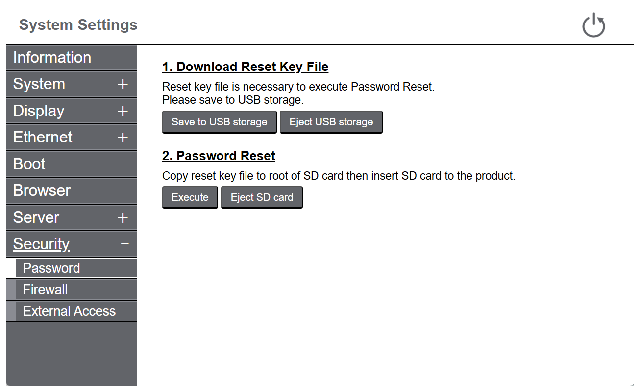 如果启用,登录屏幕上将显示 "Can't login"。如果触摸它,则会显示密码重置屏幕。有关详细信息,请参阅 复位密码。 默认: Enable 注: 如果禁用,则在忘记管理员密码时无法重置密码。请联系客户支持。在这种情况下,产品中的所有数据都将丢失。