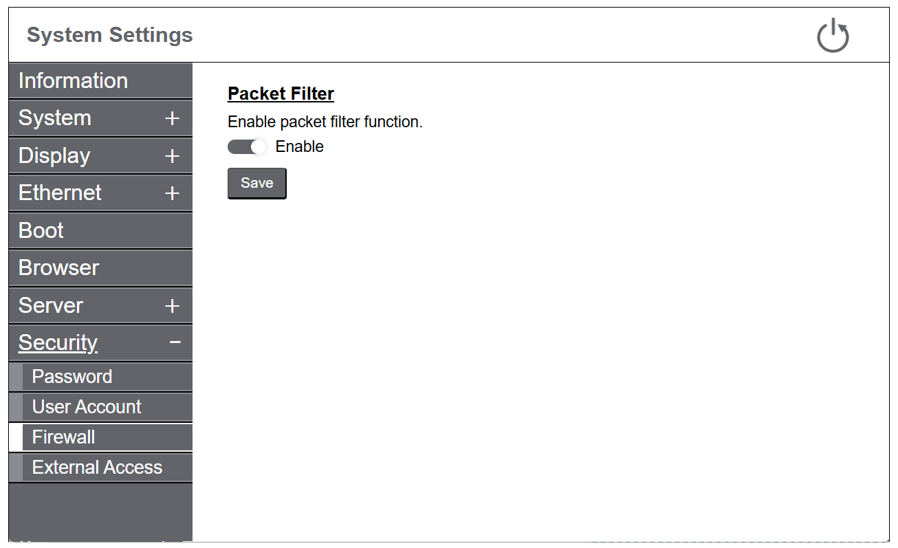 Consente di attivare o disattivare la funzione di filtro dei pacchetti. Quando la funzione di filtro dei pacchetti è abilitata, il firewall monitora il traffico di rete e determina se consentire o bloccare la comunicazione. Si consiglia di usare questa funzione senza modificare le sue impostazioni predefinite.