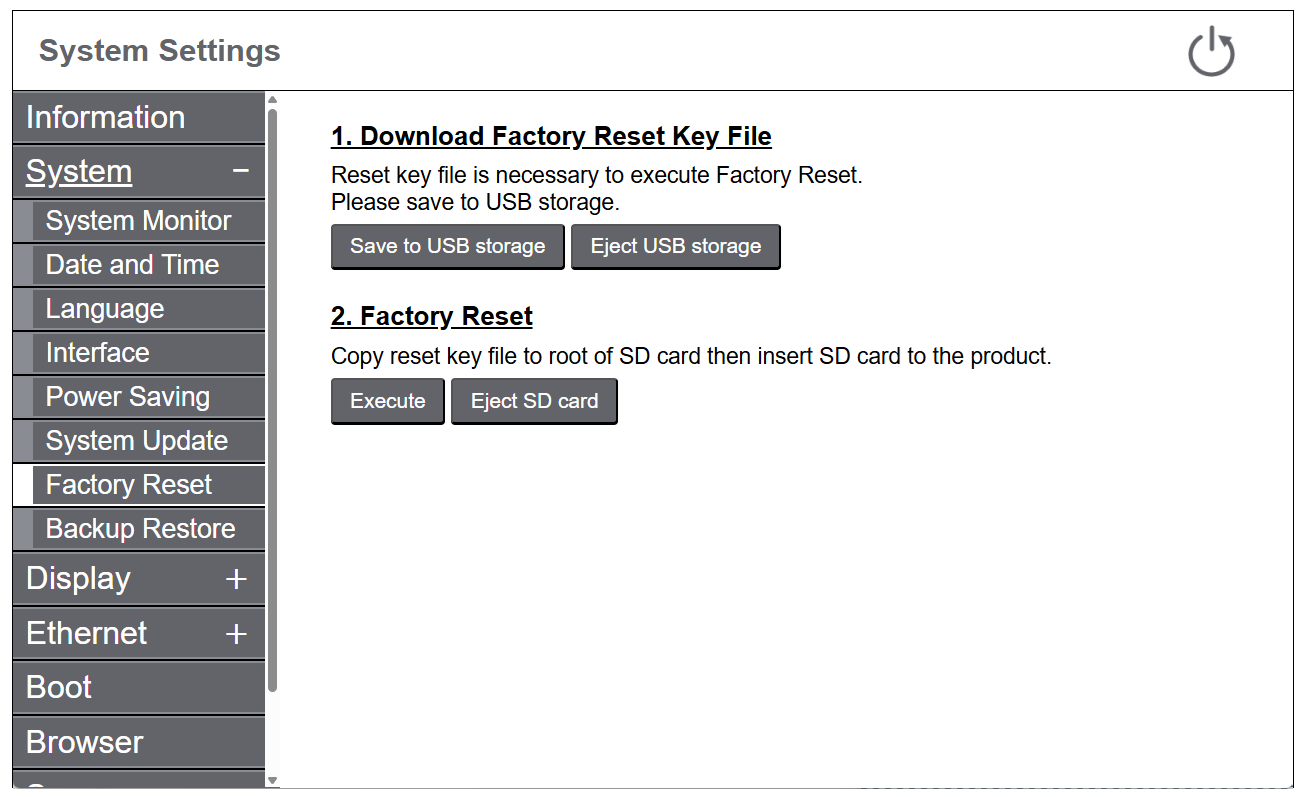 SD 카드에 있는 재설정 키 파일을 사용하여 공장 초기화를 수행합니다. |