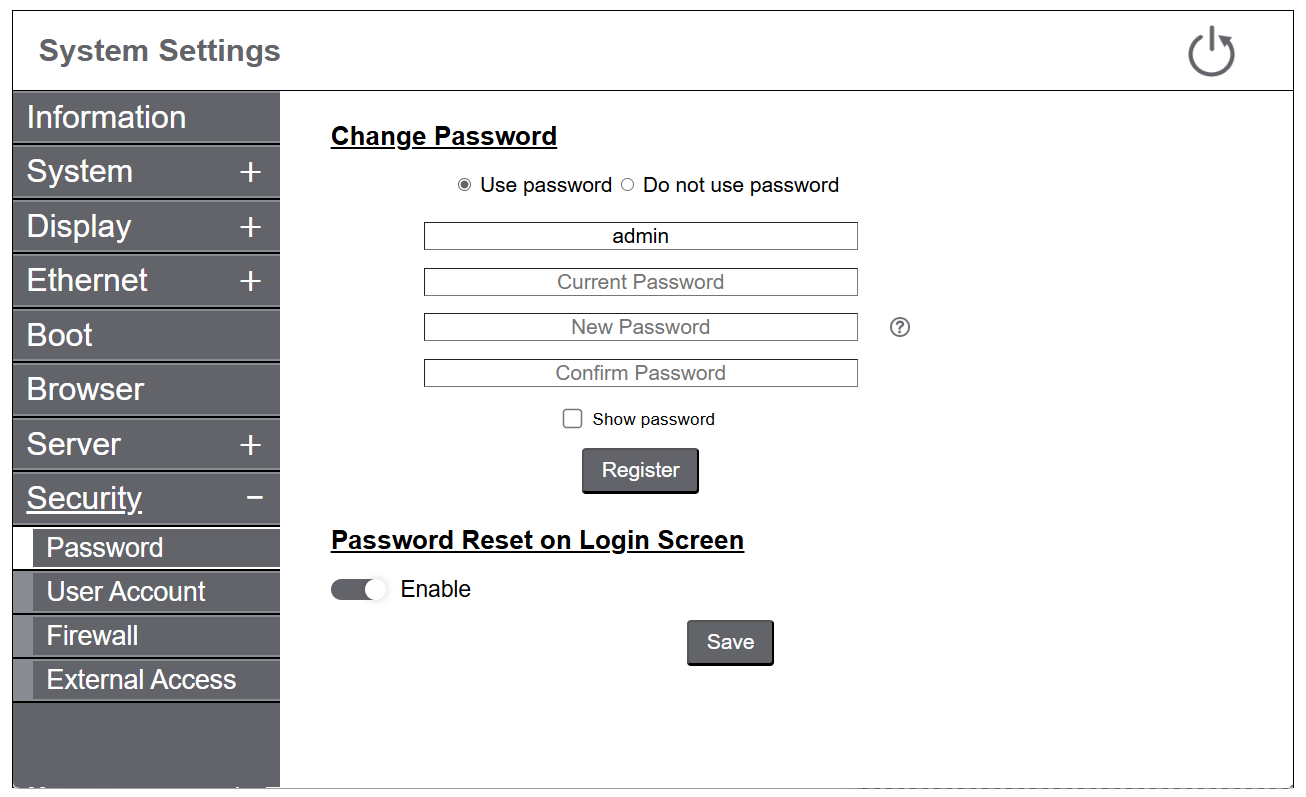 활성화되어 있으면 "Can't login"이 로그인 화면에 표시됩니다. 터치하면 암호 재설정 화면이 표시됩니다. 자세한 내용은 암호 재설정를 참조하십시오. 기본값: Enable 주의: 비활성화되어 있으면
