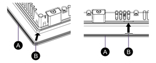 - 새 개스킷을 제품에 부착합니다. 개스킷의 네 모서리에 있는 돌출부를 제품의 네 모서리에 있는 대응하는 구멍에 끼웁니다. 모델에 따라 추가 돌출부가 있을 수 있습니다. 다음에서 오른쪽 그림을 참조하여 돌출부를 끼웁니다.
