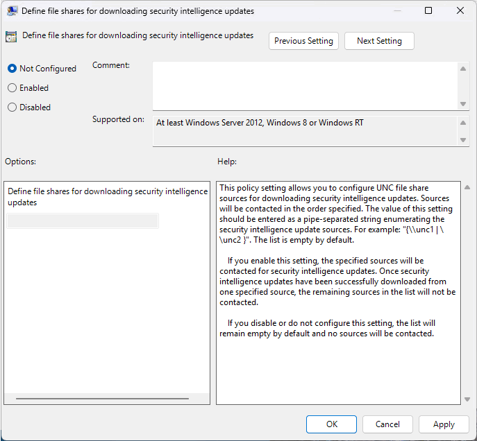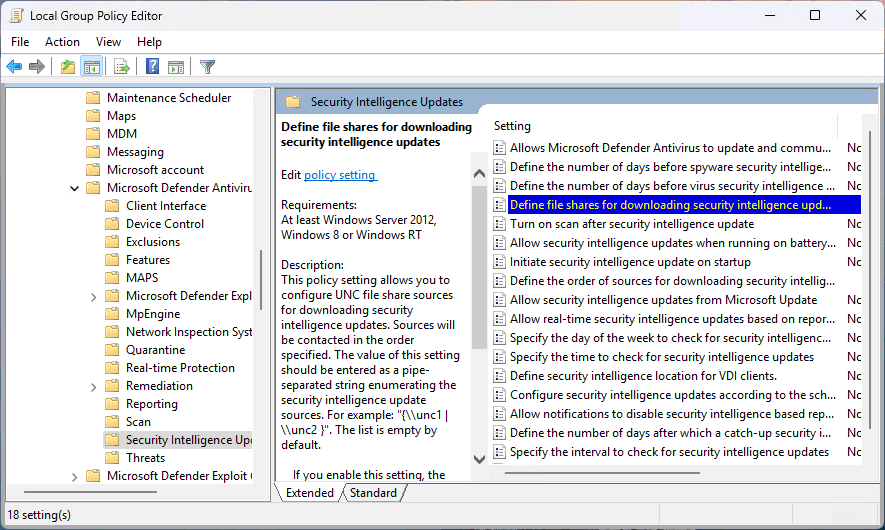 5. Open Computer Configuration > Administrative Templates > Windows Components > Microsoft Defender Antivirus > Security Intelligence Updates > Define the file shares for downloading security intelligence updates.