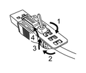 4. 按下夹子上的搭扣,将步骤 3 中的电缆完全插入 USB 主机接口。确认夹子搭扣已将USB电缆锁紧在本产品上。