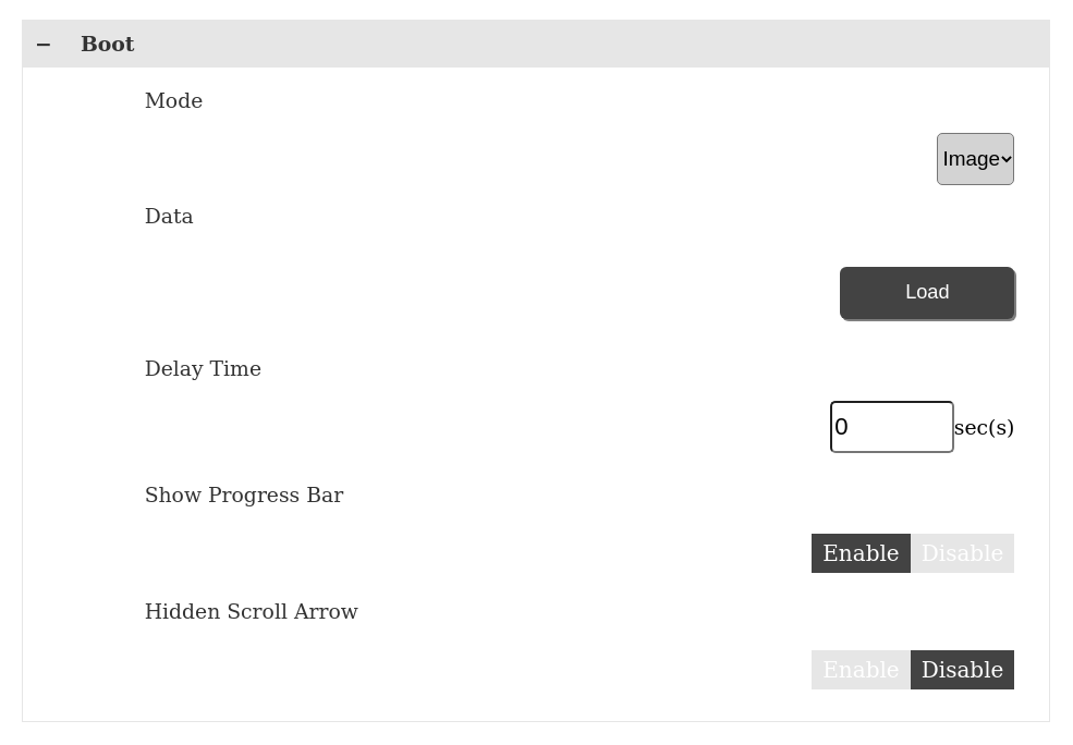 When Mode is set to [Image], touch Load to select the image to display from USB storage. The image must meet the following criteria. File size: Maximum 12 MB File format: png Image resolution: Maximum 2048 x 2048. Create the image with a resolution that matches the display resolution. NOTE: Requires saving the image with the file name “BootImg.png”