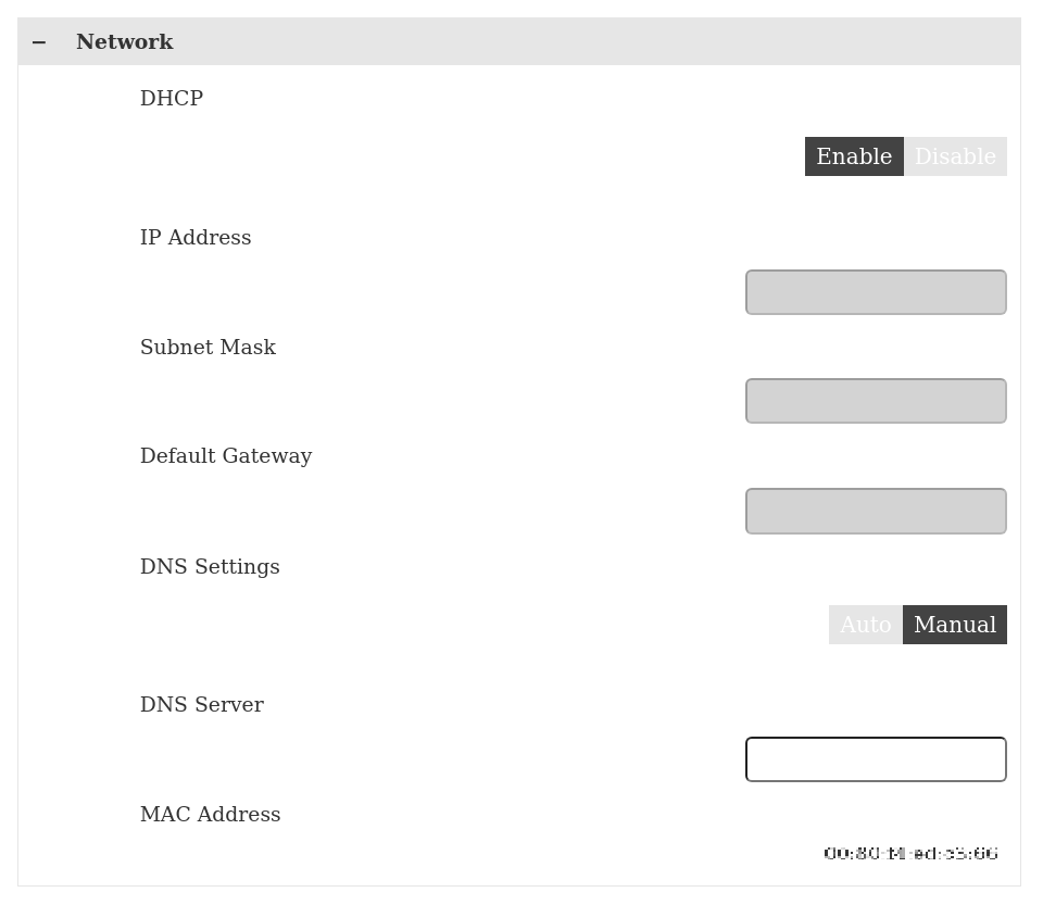 DNS サーバーからの IP アドレス取得方法を設定します。[Auto] の場合は IP アドレスを自動取得します。[Manual] の場合は DNS Server で DNS サーバーの IP アドレスを入力します。初期値は [Manual] です。 注記: [Auto] を選択する場合は、DHCP を [Enable] にしておく必要があります。