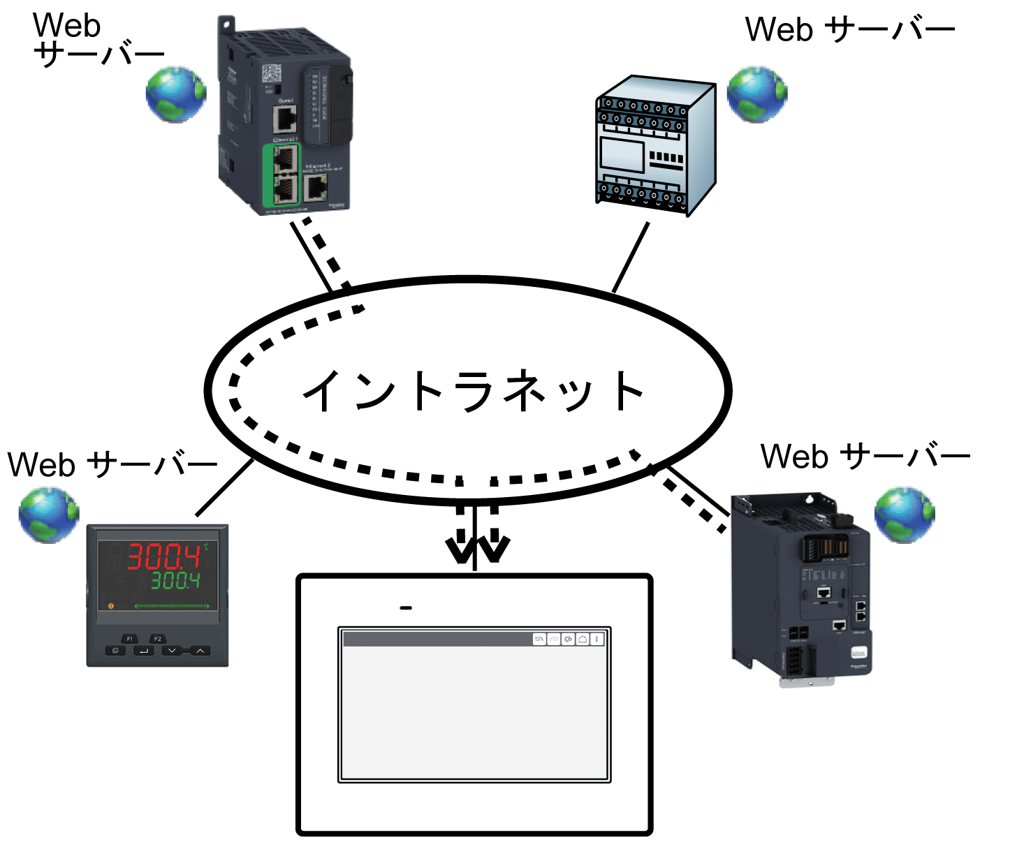 本製品は HTML5 対応の専用ブラウザーを搭載した産業用ディスプレイです。Web クライアントとして、同一イントラネット上に接続されている Web サーバーにアクセスし、そのコンテンツを専用ブラウザーで表示します。
