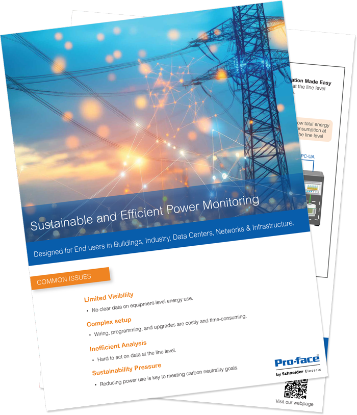 The leaflet introduces a simple retrofit solution for power monitoring using the PowerLogic PM3250 Power Meter and Pro-face HMIs. It enables line-level energy visualization without complex wiring or programming, supporting RS-485 Modbus and OPC-UA. Users can track energy consumption, CO₂ emissions, and gain actionable insights for sustainability goals in buildings, industry, and data centers.Terms of use / Cautions