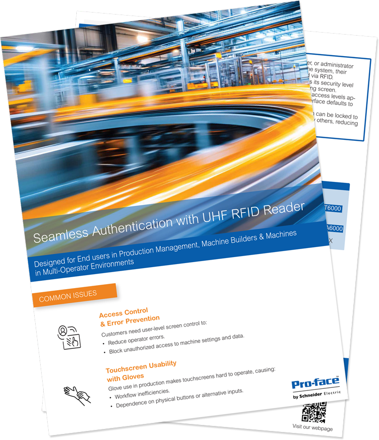 The leaflet presents an HMI solution with UHF RFID authentication for secure, hands-free access control. It enables automatic user-level screen adjustments, reducing errors and improving efficiency in multi-operator environments.Terms of use / Cautions