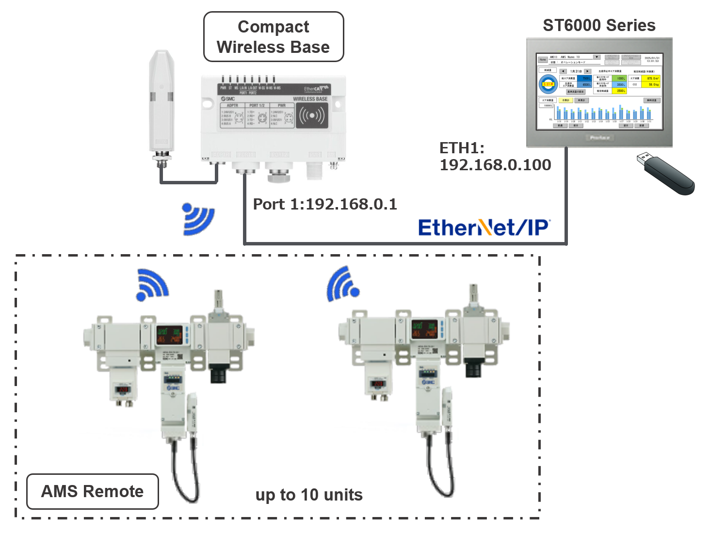 This sample project file is designed to connect the Air Management System (AMS) models AMS20/AMS30/AMS40/AMS60, manufactured by SMC Corporation, with ST6000 series. By using this project file, users can visualize the air consumption reduction effects when utilizing the AMS. One compact wireless base can be connected to up to 10 AMS remote-type units.