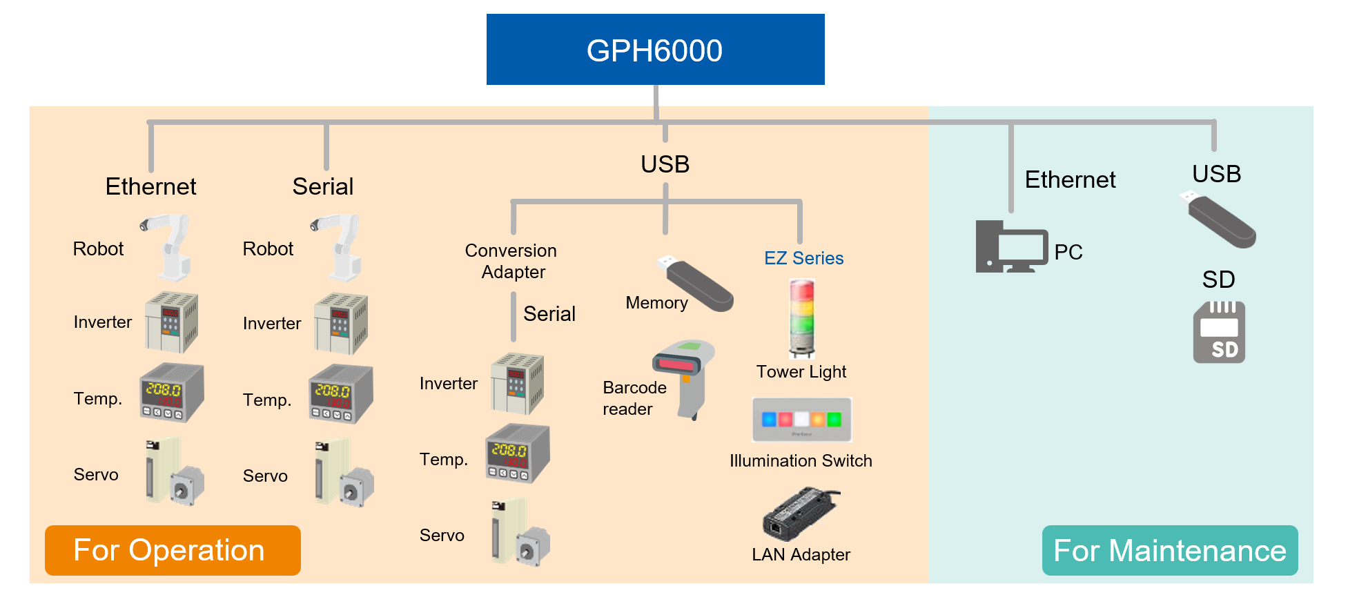 - Adapter: Easier option with IP65f protection for industrial environments