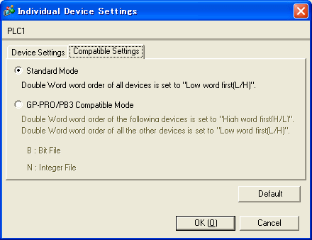 <For the protocol version 1.12.06 or above> On the [Compatible Settings] tab in the [Individual Device Settings] dialog box, you can select either "Standard Mode" or "GP-PRO/PB3 Compatible Mode". If you select the "Standard Mode", the order for all devices will be set to "low word first (L/H)" according to the specification of 32-bit data L/H settings of the PLC ladder tool. If you select the "GP-PRO/PB3 Compatible Mode", the 32-bit data L/H storing order for some devices will be "high word first (H/L)" according to the specification of GP-PRO/PB III. If you convert a project file of GP-PRO/PB III while selecting this mode, a warning message will appear. In this case, select the "Standard Mode" for the compatible setting, and the project file will be converted. If you convert a project file of GP-PRO/PB III specifying the ContorolLogix/CompactLogix series, the warning message will not appear.
