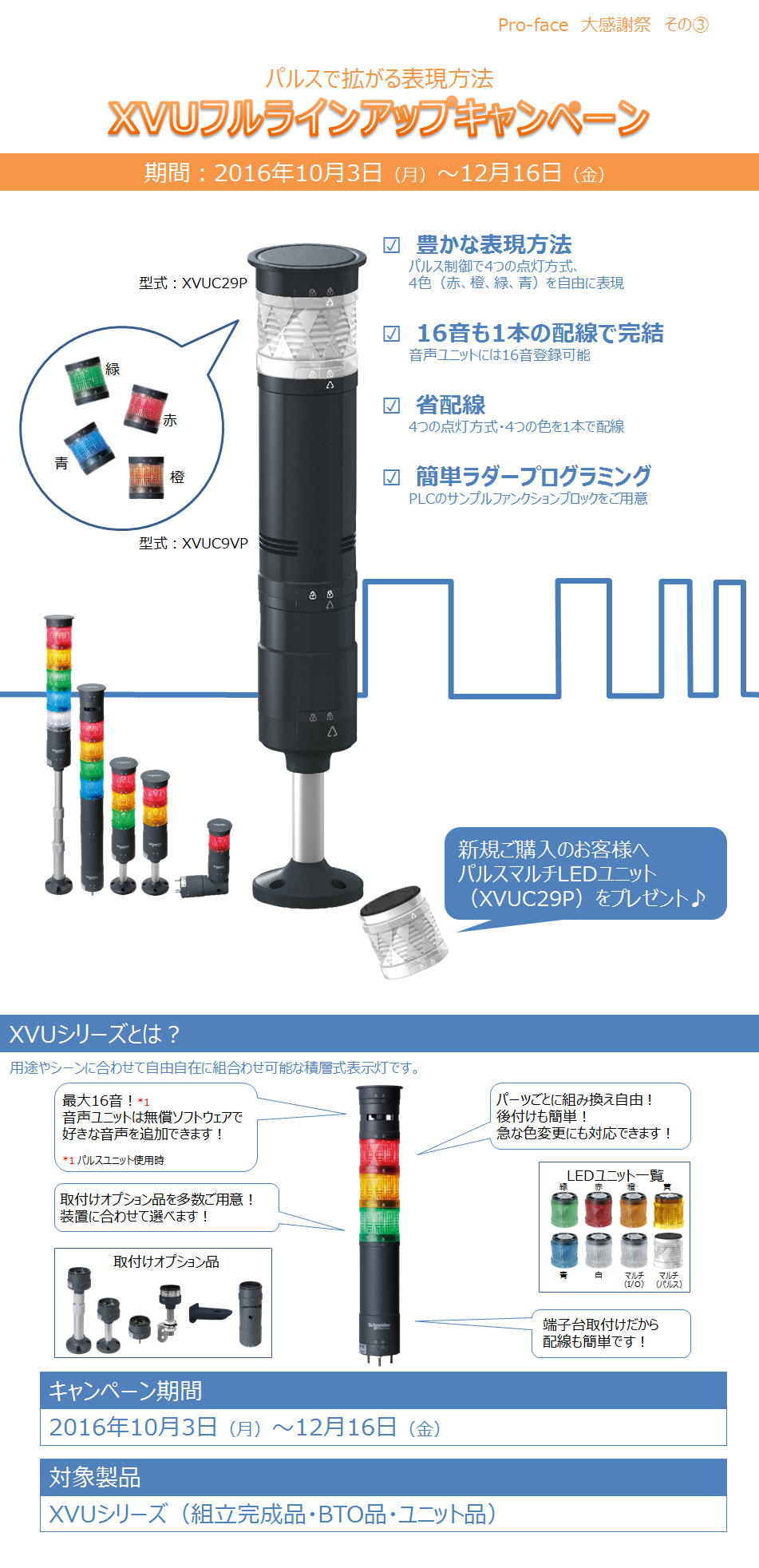 | 内容 | 期間中に対象製品を新規ご購入のお客様へ、パルスマルチLEDユニット(XVUC29P)をプレゼント! |