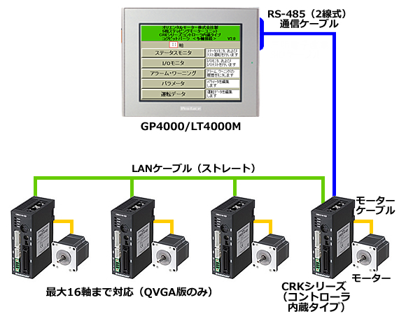 GP4000、GP3000、LT4000Mシリーズとモータードライバを接続することで、モーターの操作と状態監視ができます。