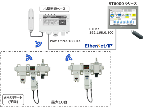 本接続機器サンプル(コクピットパーツ)は、SMC株式会社製のエアマネジメントシステム(以下、AMS)AMS20/AMS30/AMS40/AMS60とST6000シリーズとの接続するためのサンプルプロジェクトファイルです。本プロジェクトファイルを使用することで、AMS使用時のエア消費量の削減効果を可視化できます。1台の小型無線ベースと最大10台のAMSリモートタイプが接続対象となります。