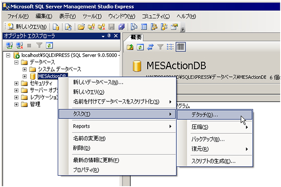 1.2 [MESActionDB]を右クリックして、表示されるメニューから[タスク]を選択し、[デタッチ]をクリックしてください。