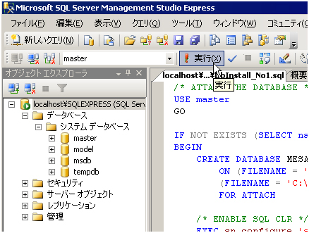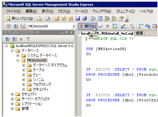 5.4 「DbInstall_No1.sql」 を実行しMESActionDBをアタッチします。ツールバーの[実行]をクリックしてください。