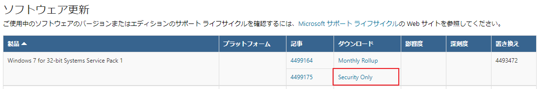 2. ソフトウェア更新欄から[Windows 7 for 32-bit Systems Service Pack 1]-[ Security Only]を選択してください。