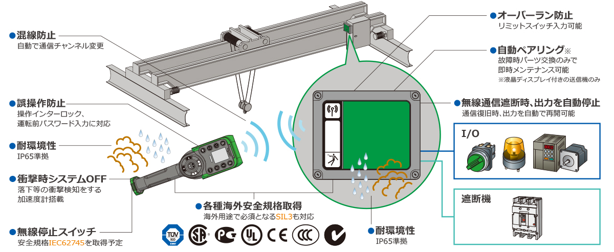 安全度水準(SIL)とは、IEC 61508においてシステムの安全性能を表す尺度。安全システムの機能が正しく動作しているか、平均修理時間、故障率など信頼性基準の一つです。 SIL4が最高水準で、無線ホイストシステムはSIL3に対応しています。