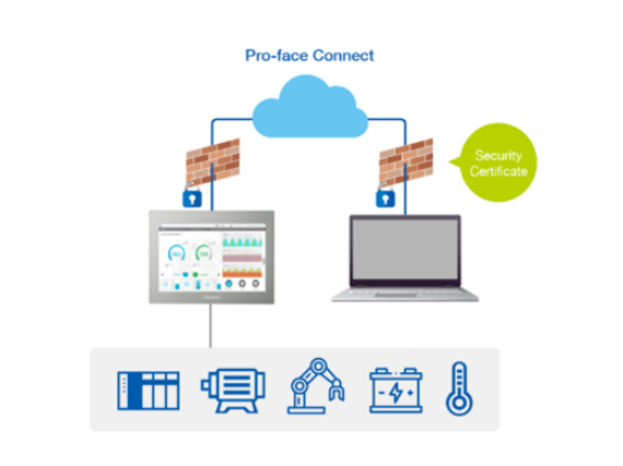 セキュアリモートアクセス「Pro-face Connect」は、 Pro-face製のHMIを通じてわずかな工数・コストで遠隔監視 の実現をサポートするソフトウェアです。 クラウドベースのPro-face Connectは、HTTPSベースかつ TLS暗号化通信により、既存のネットワークにシームレスに安 全な遠隔監視ソリューションを実現できます。