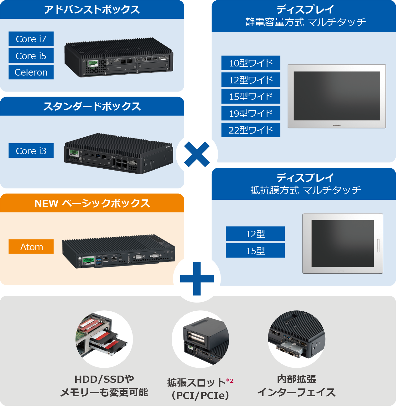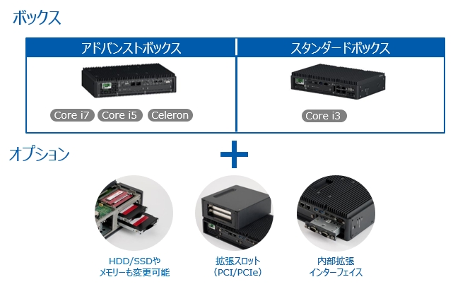 7種のディスプレイと5種のボックスから好きな組み合わせを選択。オプションでインターフェイスや拡張スロットを追加してCTO(Configure To Order:組込み出荷サービス)方式でご注文が可能です。