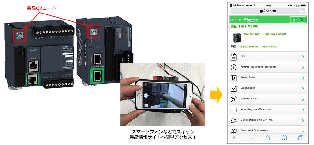 製品前面のQRコードをスマートフォンなどでスキャンして製品情報へ!パソコンやマニュアルがなくても、その場で製品情報に簡単アクセス!