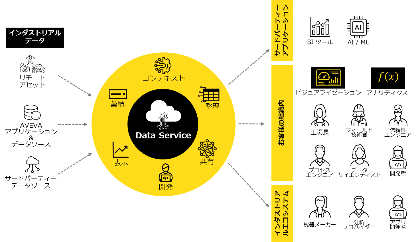 BI、AI、MLツール用の一元的なデータリポジトリを構築・管理した上で、明示的に許可したユーザーへのみデータを安全に共有します。これによって、サードパーティープロバイダーなど組織の壁を越えて産業データにアクセスし、拡張的なデータの活用が可能になります。