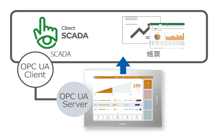 HMIをOPCサーバーとして、各種OPC UAクライアントと接続し、データ連携が可能です。