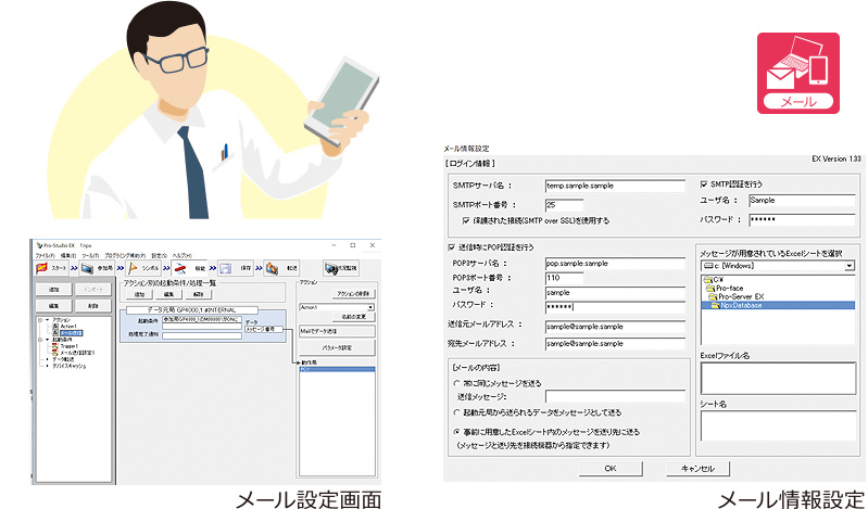 現場の異常アラームなど、あらかじめ設定したイベントに関連付けてメール送信ができます。異常発生時に、復旧担当者を呼び出す手段として活用すれば、迅速な対応が可能です。