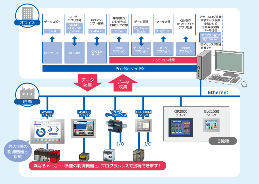 Pro-Server EXは、現場とオフィスのネットワーク化を、かんたん・低コストで実現するデータ管理の決定版ソフトウエアです。製造現場のムダを省き、多様化したニーズに対応するための最初の一歩は、設備すべてのデータを取得することです。製造現場で抱える課題に対して、Pro-Server EXが最適な手法を実現します。