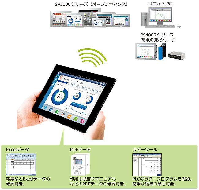Windowsアプリを使用できるSP5000、弊社産業用コンピュータ、PC/AT互換機(パソコン)にPro-face Remote HMI Serverをインストールすることで、Pro-face Remote HMI/Pro-face Remote HMI Client for Winを利用可能に。HMI画面以外に、ExcelやPDFなどのWindowsアプリもモニタリング・操作することができます。