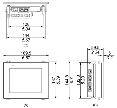 | パネルカット寸法 | パネルカット寸法図 取り付け条件 A. 盤内温度 B. 盤外温度 A. 電源コネクターまたは電源端子台 取り付け角度 取り付け間隔 |