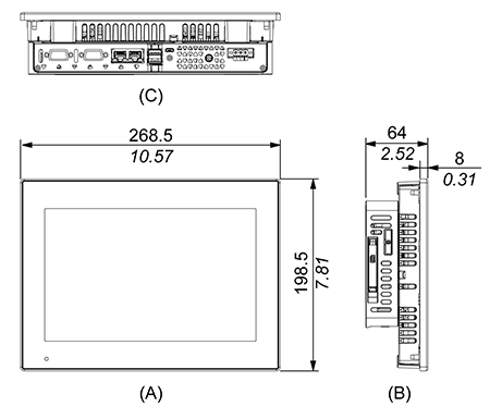| パネルカット寸法 | パネルカット寸法図 取り付け条件 A. 盤内温度 B. 盤外温度 A. 電源コネクターまたは電源端子台 取り付け角度 取り付け間隔 |