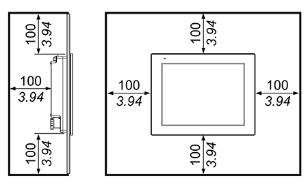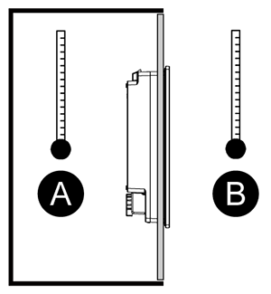| パネルカット寸法 | パネルカット寸法図 取り付け条件 A. 盤内温度 B. 盤外温度 A. 電源コネクターまたは電源端子台 取り付け角度 取り付け間隔 |