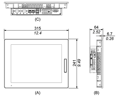 | 保護等級 | • 正面 工場出荷時に取り付け済みのフロントUSB カバーを使用する場合:IP65F、IP67F、UL 50/50E、タイプ1 ネジ付きフロントUSB カバー(PFXZCDCVUS1) を使用する場合:IP66F、IP67F、UL 50/50E、タイプ1、タイプ4X (室内専用)、タイプ12、タイプ13 注記: パネル埋込時のフロント面、フロントUSB 未使用時。 • 背面 IP20 |
