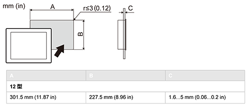 | パネルカット寸法 | 301.5(+1/-0)x 227.5(+1/-0)mm 、パネル厚範囲:1.6~5 mm |