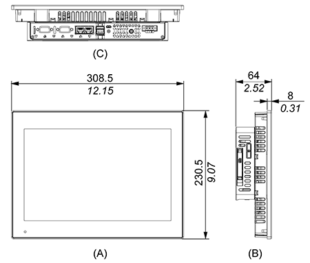 | 外形寸法図 | 外形寸法図 A. 正面図 B. 左側面図 C. 底面図 |