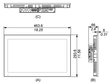 | 外形寸法図 | 外形寸法図 A. 正面図 B. 左側面図 C. 底面図 |