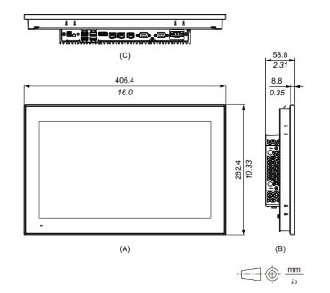 外形寸法図 | 外形寸法図 (A):前面 (B):左側面 (C):底面 |