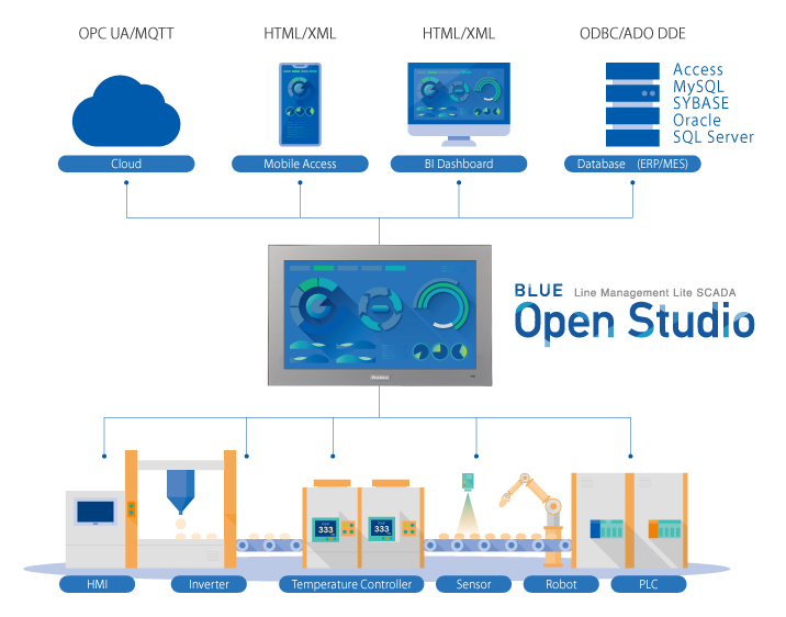 Windows Embedded Compact Edition을 비롯한 모든 SQL 데이터베이스 (Microsoft SQL, MySQL, Sybase, Oracle) 또는 Microsoft 액세스 또는 엑셀및 ERP / MES 시스템 (SAP 포함)에 연결할 수 있습니다. BLUE Open Studio는 유연성이 뛰어나 트렌드, 알람 / 이벤트, 그리드 및 기타 객체에 대한 SQL 지식이 필요없는 내장 인터페이스를 제공합니다.