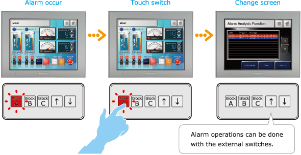 EZ 일루미네이션 스위치는 현재 상태에 대하여 서로 다른 색을 이용해 알람 내용을 지시합니다. 화면 내 모든 알람 이력은 EZ 일루미네이션 스위치를 이용하여 확인 및 조작이 가능합니다. 현재 표시되지 않은 화면, 대기 화면에 대해서도 알람 상태를 빠르게 체크할 수 있습니다