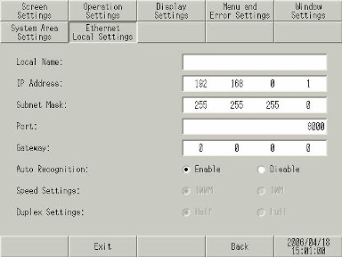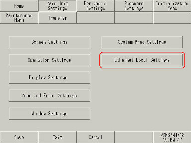 | The following explain how to connect the GPs via a Network. | | 1. | Transfer to "Initial Transfer Mode". Touch The [Main Unit Settings]. | |  | | Please refer to how to transfer "Initial Transfer Mode", Please click below, | | 2. | Displaying the Setting Screen to fix System of GP. Touch the [Ethernet Local Settings]. | |  | | 3. | Enter the numbers of thr IP address, Subnet Mask, DEfault Gateway and Self Node. Regarding the Values to set, please contact the network sdministrator. | |  | | | MEMO | | ・ | If no relay device to the other network such as a router is connected, it is not necessary to input about [Default Gateway]. | | | | |