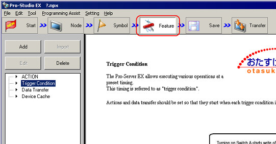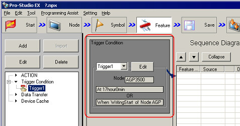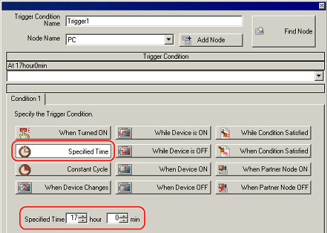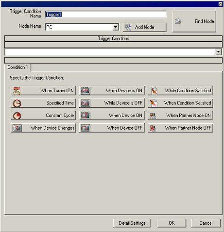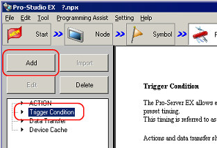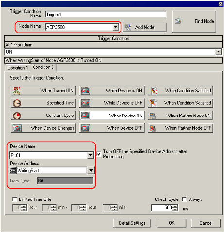 You can set up plural "Trigger Conditions" when operationg ACTION or Dara Transfer. | Foe example, as like as bellow, you can operate "ACVTION" when one of 2 "Trigger Conditions" was filled up that conditions were [17:00 on evert day] or [Bit -ON for the Writing Start]. | |  | This sample is as follows when you set up same of "Trigger Condition" of above. ( *Supposing "AGP3500" as a "Entry Node" and "Writing Srart" as a "Symbol sheet" were registerd.) | 2. | Choose [Trigger Condition], and click [Add]. | | | | | | 3. | Displaying the Window that set up "Trigger Condition". | | | | | | 4. | Set up 1st "Trigger Condition. Choose [Specified Time] , and set up 17:00. | | | | | | 5. | Add "Trigger Condition". Choose [OR]. | |  *When you want to set up both conditions, choose "AND". | | | | 6. | [Condition 1] add. Set up 2nd condition. Choose [Condition 2] and [When Device ON]. | | | | | | 7. | Set up "Node Name", "Device Name" and select a Symbol from "Device Address" In here, set up "AGP3500" as a "Node Name", "PLC1" as s "Device Name" and "Writing Start" as a "Device Address". | | | * | "Device Address" will be Turn OFF automatically after Processing when you Check the box for [Turn OFF the Specified Device Address after Processing]. | | | | | 8. | The "Trigger Condition" set up already. | | | |